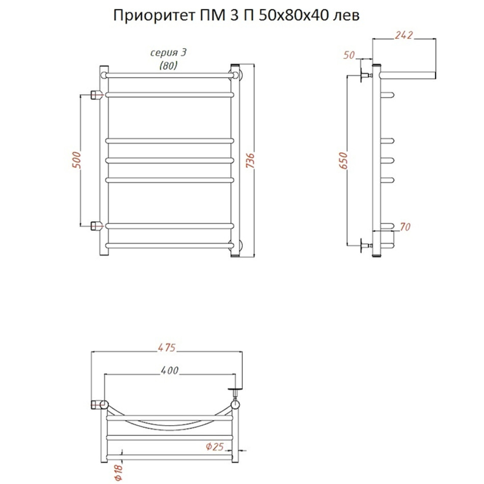 Полотенцесушитель Тругор Приоритет ПМ 3 П 50*80*40 (ЛЦ2) ЛЕВЫЙ, ширина 40 см, высота 80 см, боковое подключение 50 см, с полкой, хром