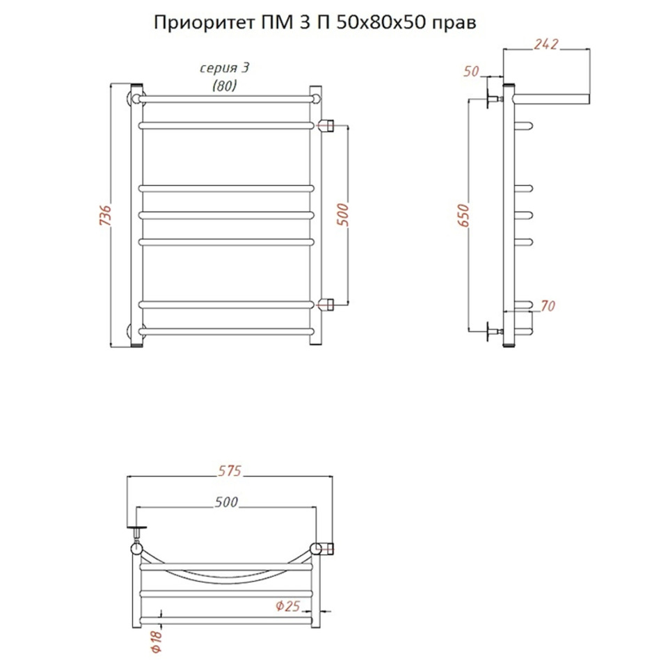 Полотенцесушитель Тругор Приоритет ПМ 3 П 50*80*50 (ЛЦ2) ПРАВЫЙ, ширина 50 см, высота 80 см, боковое подключение 50 см, с полкой, хром