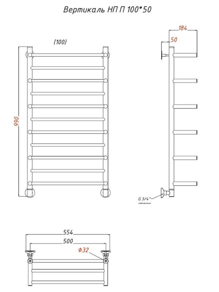 Полотенцесушитель Тругор Вертикаль НП П 100*50 (ЛЦ35), ширина 50 см, высота 100 см, с полкой, хром