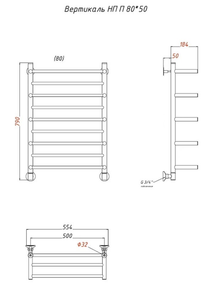 Полотенцесушитель Тругор Вертикаль НП П 80*50 (ЛЦ35), ширина 50 см, высота 80 см, с полкой, хром
