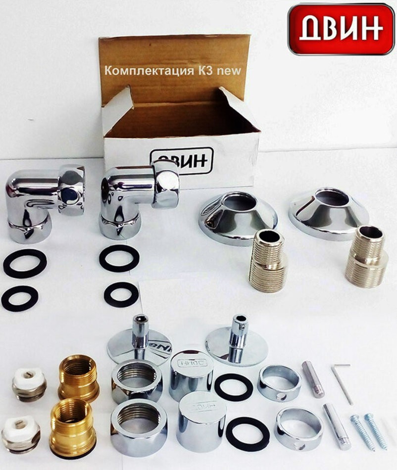 Комплектация К3: полотенцесушитель, клапан Маевского – 2шт., декоративный колпачок – 2 шт., крепеж телескопический - 2 шт., уголок гайка/гайка 1/ ¾ - 2 шт., отражатель глубокий ¾ - 2 шт., эксцентрик ¾ / ½ - 2 шт.).