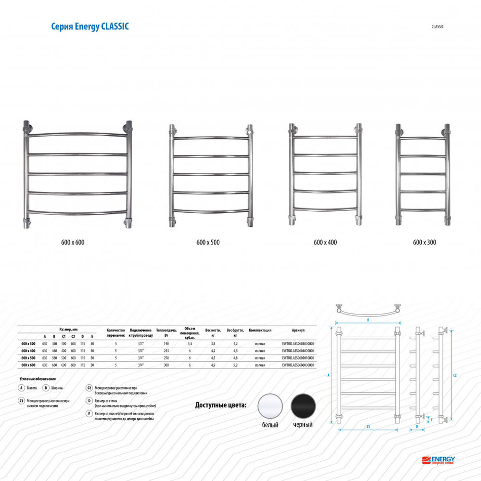Полотенцесушитель водяной Energy Classic 600 x 400, ширина 46 см, высота 63 см, черный матовый, EWTRCLASS06040R905M