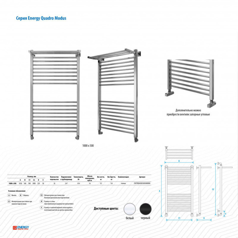 Водяной полотенцесушитель Energy Quadro Modus 1000x500 типа "лесенка с полкой" отличается оригинальной конструкцией: вертикальные трубы имеют квадратное сечение, а горизонтальные перемычки - круглое сечение. Дополнительная обогреваемая полка из 3 перекладин увеличивает тепловую мощность и полезную площадь прибора. Используется во всех системах горячего водоснабжения и отопления с рабочим давлением 3 - 15 атм при температуре теплоносителя до 105°С. Межцентровое расстояние: 1000 мм (+/-5 мм) при боковом и диагональном подключении, 500 мм (+/-5 мм) при нижнем подключении. В комплектацию входят эксцентрики, позволяющие отрегулировать межцентровое расстояние.Полотенцесушитель изготовлен из высококачественной импортной пищевой нержавеющей стали марки AISI 304 (08Х18Н10). Поверхность обработана методом электроплазменной полировки, не тускнеет и устойчива к небольшим механическим повреждениям. Сварка швов выполнена по специальной технологии TIG по международному стандарту EN 10217-7. Полотенцесушитель испытан при давлении 50 атм, составляющая его труба — 150 атм, благодаря чему имеет большой запас прочности.Произведен в России. Гарантийный срок - 5 лет.Комплектуется всем необходимым для монтажа. Вся фурнитура производится итальянской фирмой Smart.