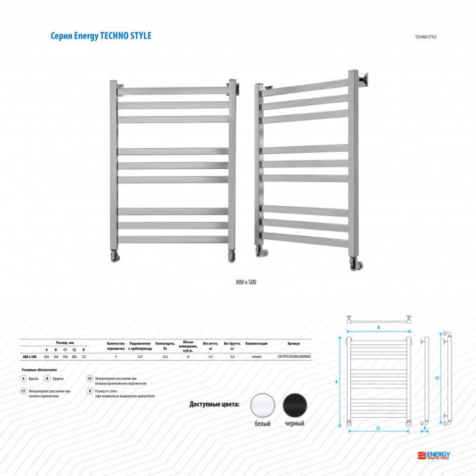 Полотенцесушитель водяной Energy Techno Style EWTRTECHS0805000000, ширина 50 см, высота 80 см, универсальное подключение, цвет хром