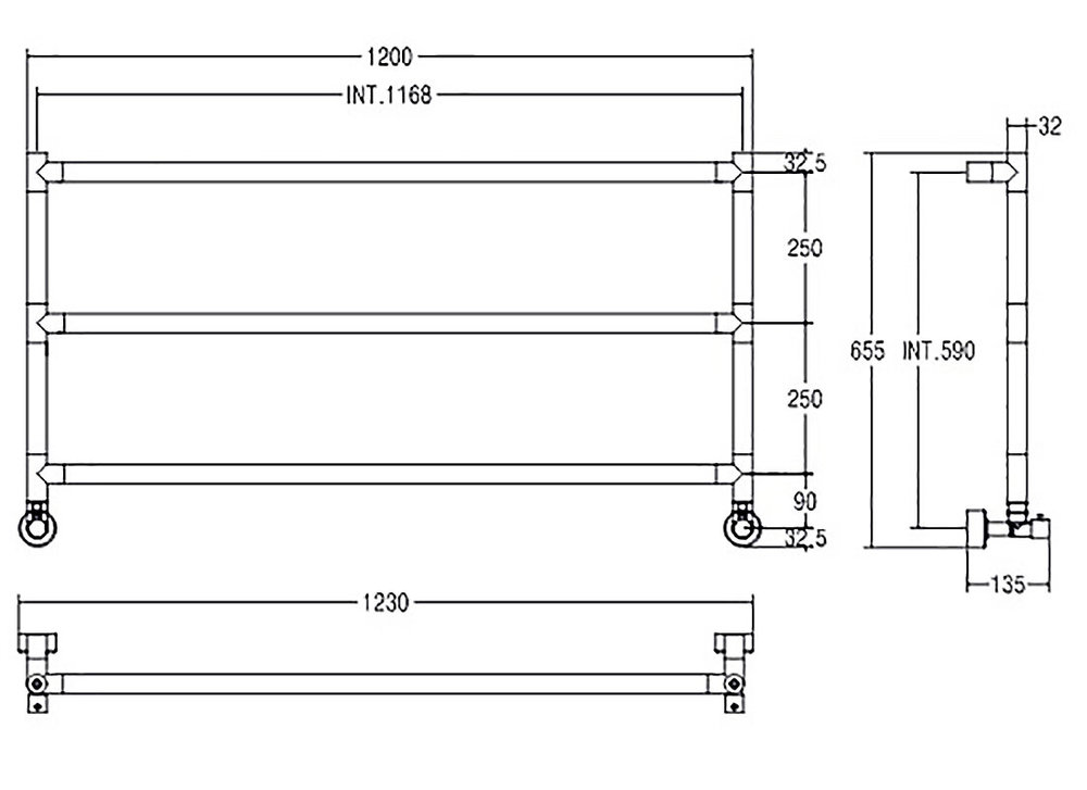 Стационарный модульный полотенцесушитель из латунной трубы диаметром Ø32 мм присоединяется к отопительной системе водоснабжения.