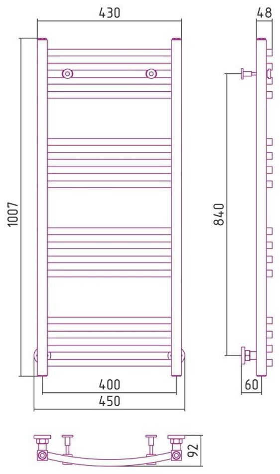 - Межосевое расстояние: для бокового подключения - 100 см, нижнее подключение - 40 см