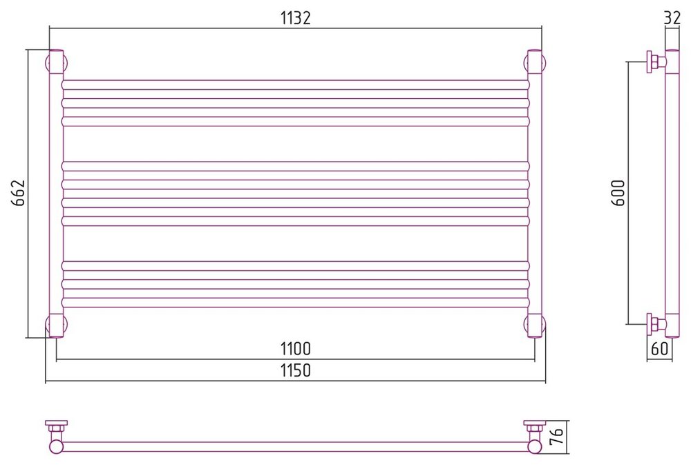- Межосевое расстояние: для бокового подключения - 60 см, нижнее подключение - 110 см