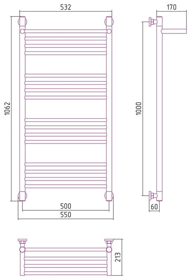 Межосевое расстояние: - нижнее подключение X (мм)500 - диагональное подключение Y (мм)1000 - вертикальное подключение Y (мм)1000Внешние габариты (высота х ширина х глубина) (мм)1062x550x213Подключение УниверсальноеМатериалНержавеющая сталь AISI 304 L (04X18H10)Объем помещения (м³)14.6Теплоотдача (Qвт)583Рабочее давлениеот 3 до 15 атмДавление испытаний25 атмТемпература теплоносителядо 95°СОбъем (м³)0.048