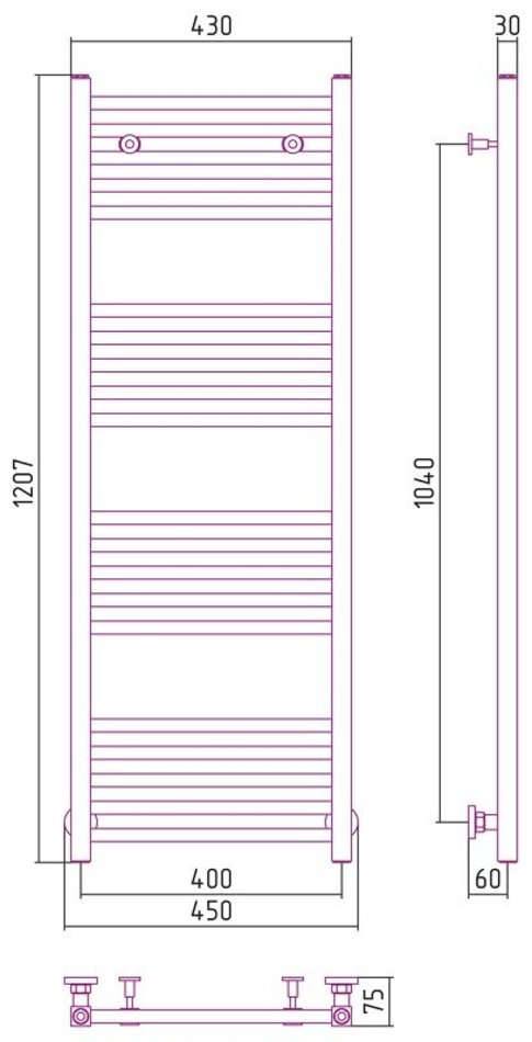 - Межосевое расстояние: для бокового подключения - 120 см, нижнее подключение - 40 см