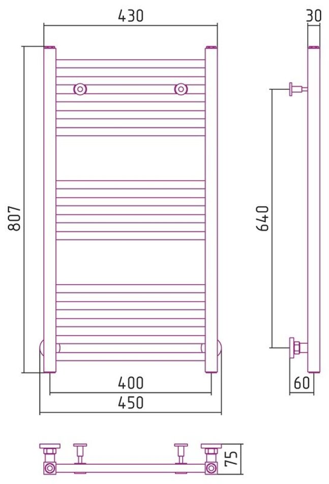 - Межосевое расстояние: для бокового подключения - 80 см, нижнее подключение - 40 см