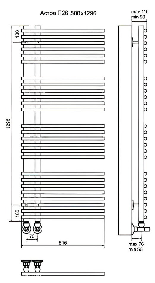 Полотенцесушитель водяной Terminus Астра, 32/18, П26, ширина 50 см, высота 129,6 см, хром