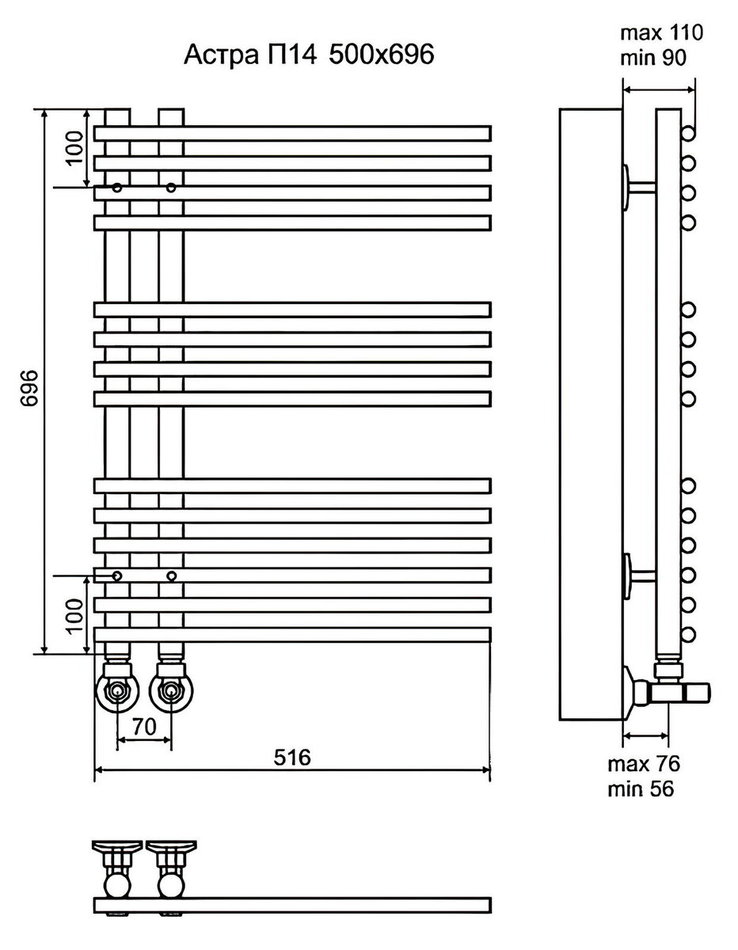 Полотенцесушитель водяной Terminus Астра П14 500x696, ширина 51.6 см, высота 69.6 см, хром