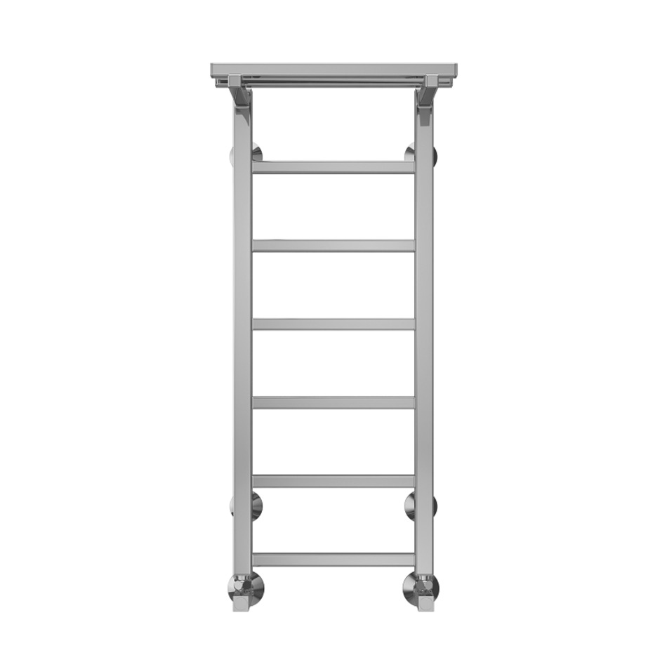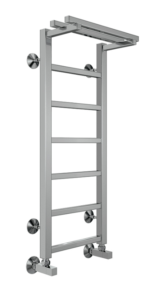 Модель "Контур с полкой" относится к линейке в стиле хай-тек, тяготеющей к лаконичным формам и хромированным поверхностям, и отличается наличием дополнительной прогреваемой полки для хранения и сушки полотенец.