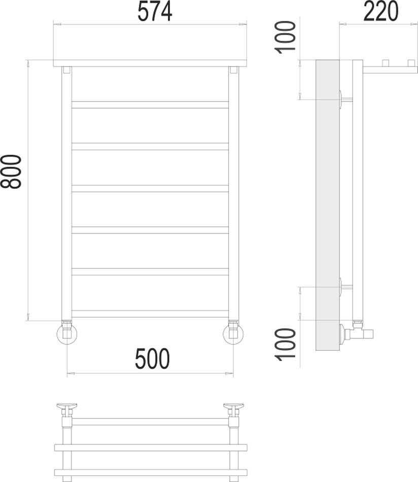 Полотенцесушитель водяной Terminus Контур с/п П7 500х800, ширина 57 см, высота 80 см, с полкой, нижнее подключение 50 см, цвет нержавеющая сталь