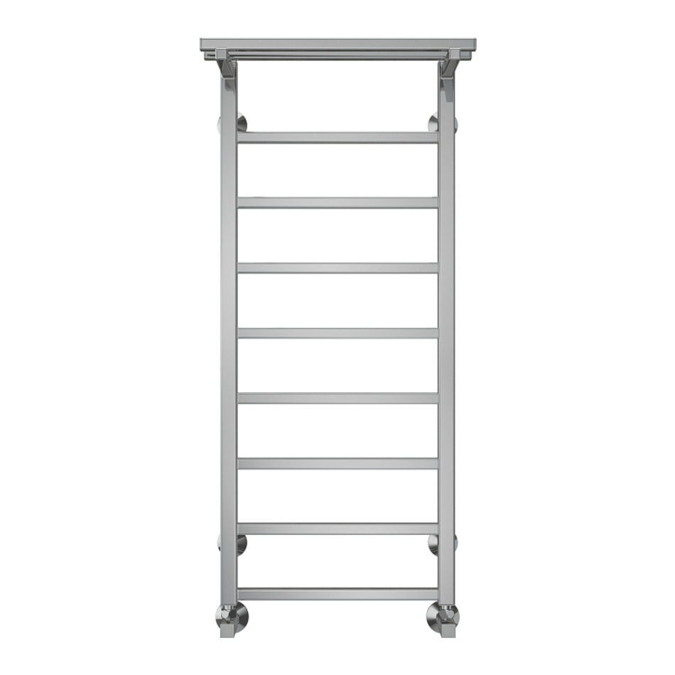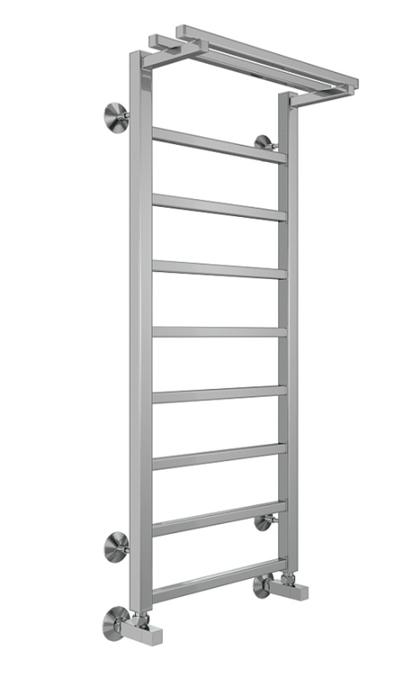 Модель "Контур с полкой" относится к линейке в стиле хай-тек, тяготеющей к лаконичным формам и хромированным поверхностям, и отличается наличием дополнительной прогреваемой полки для хранения и сушки полотенец.
