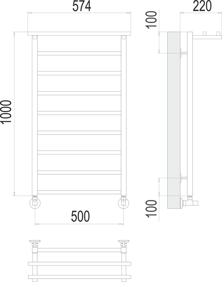 Полотенцесушитель водяной Terminus Контур с/п П9 500х1000, ширина 57 см, высота 100 см, нижнее подключение 50 см, с полкой, цвет нержавеющая сталь