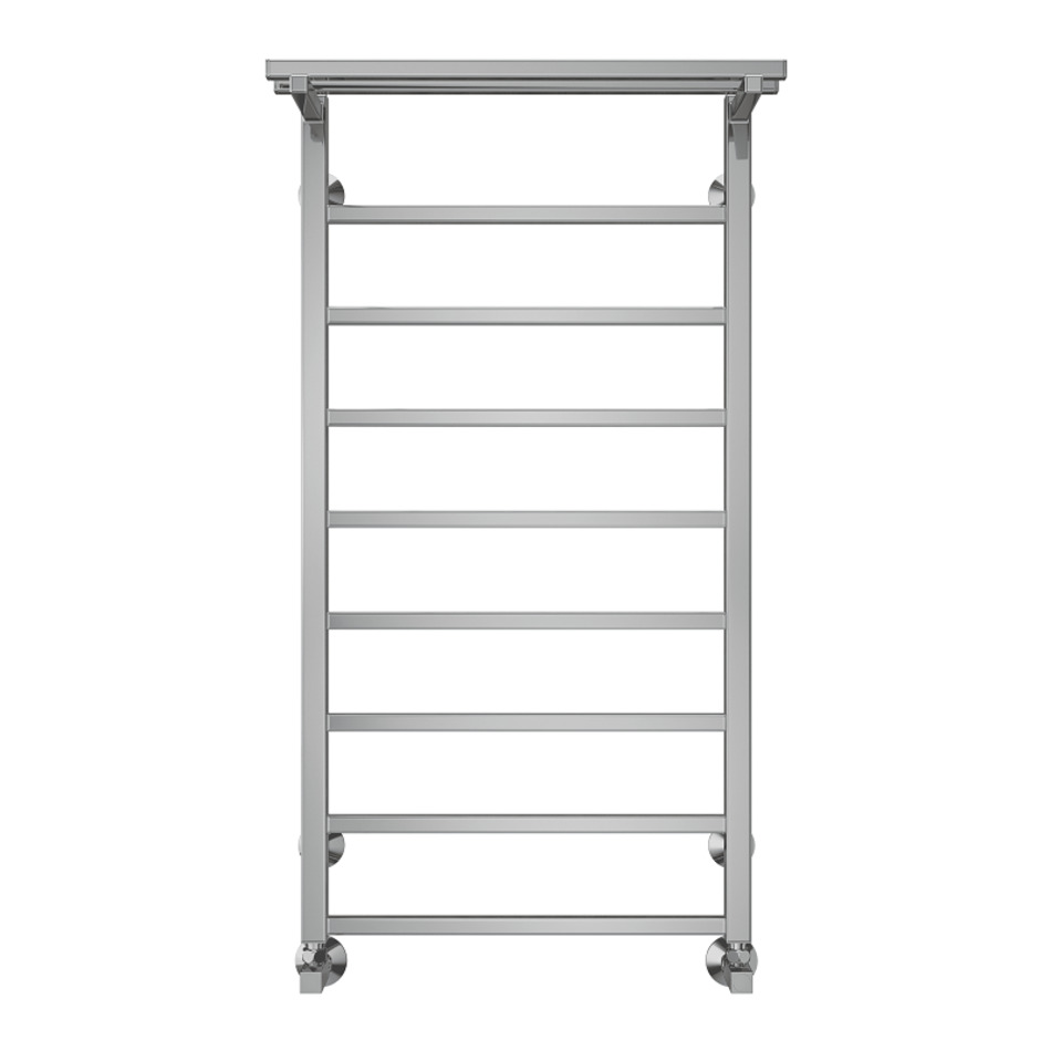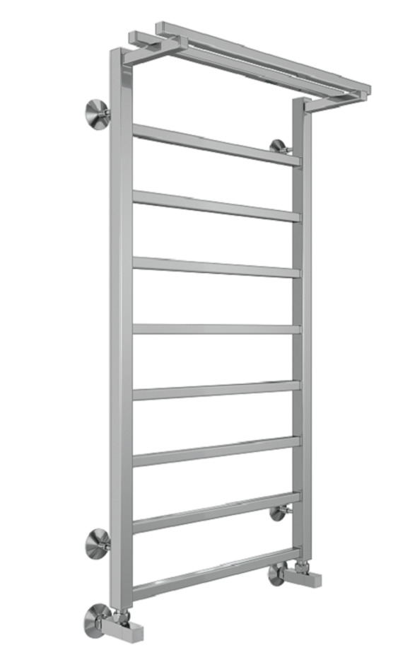 Модель "Контур с полкой" относится к линейке в стиле хай-тек, тяготеющей к лаконичным формам и хромированным поверхностям, и отличается наличием дополнительной прогреваемой полки для хранения и сушки полотенец.