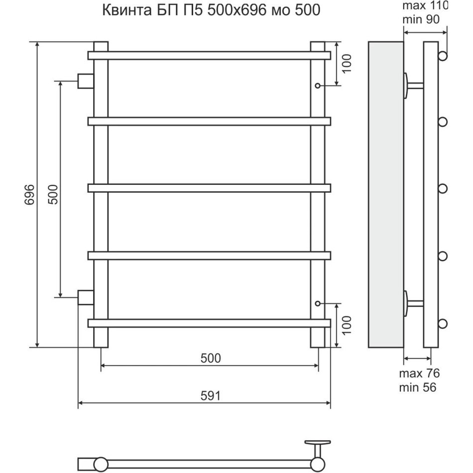 Полотенцесушитель водяной Terminus Квинта П5 500x696-500, ширина 59.1 см, высота 69.6 см, боковое подключение 50 см, хром