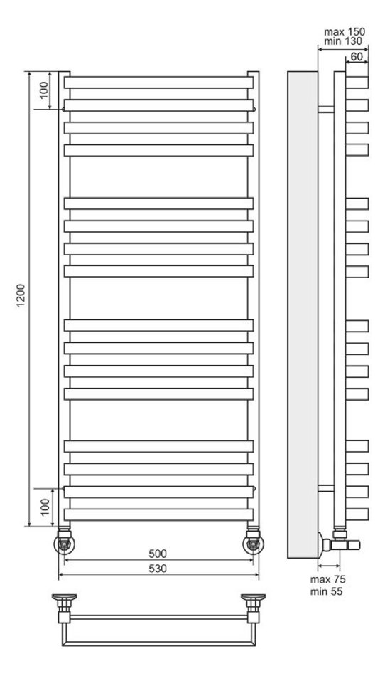 Комплектация: полотенцесушитель, комплект вентиль угл 3/4х1/2 г/ш квадрат(2шт), эксцентрик(2шт), отражатель(2шт)