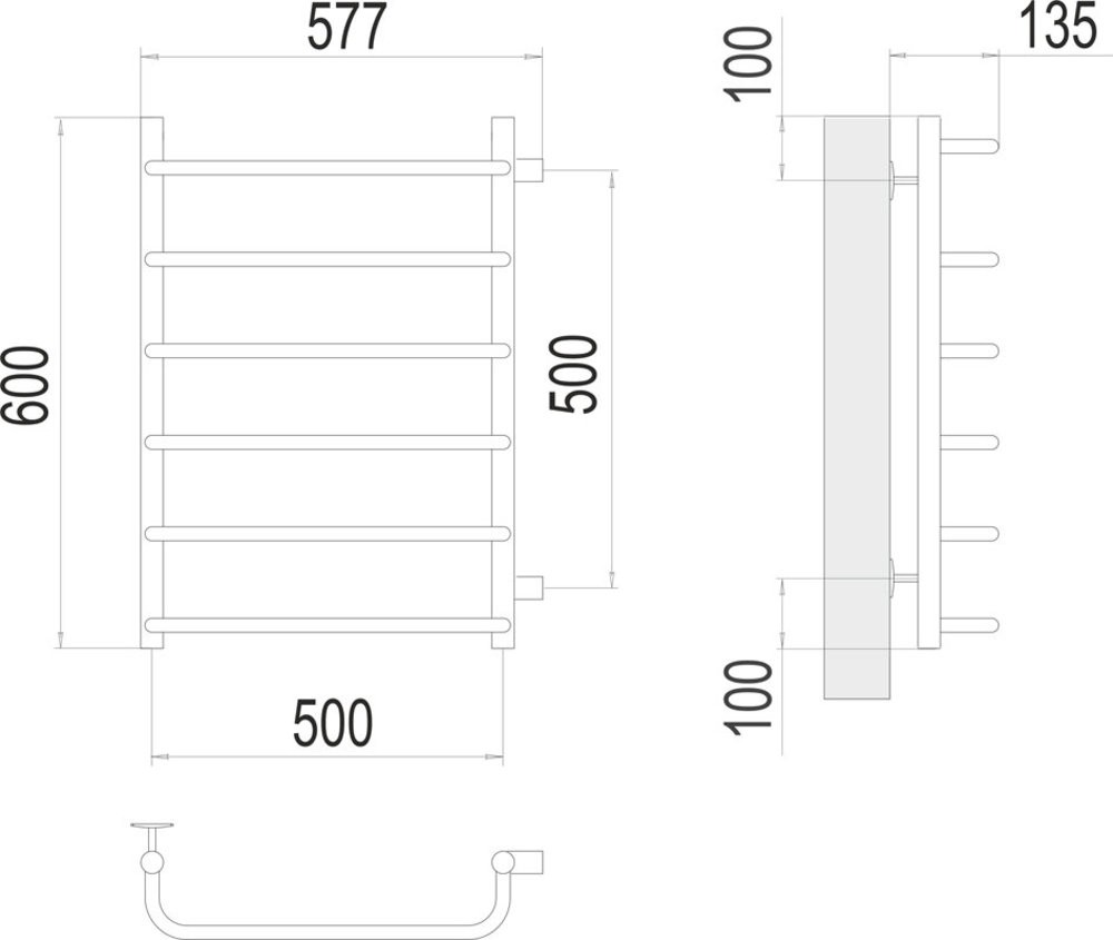Полотенцесушитель водяной Terminus Стандарт 4670078530349, П6 500х600, ширина 57.7 см, высота 60 см, боковое подключение 50 см, хром
