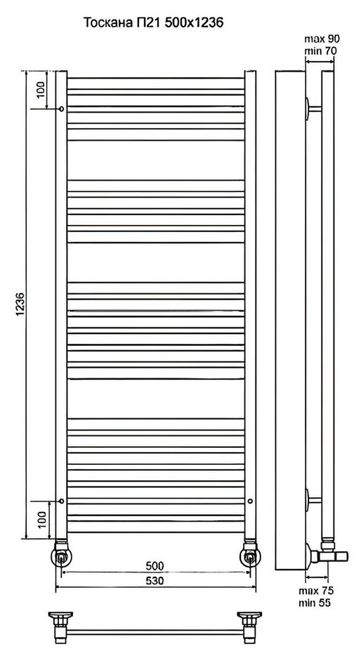 Полотенцесушитель водяной Terminus Тоскана П21 500x1236, ширина 53 см, высота 123.6 см, хром