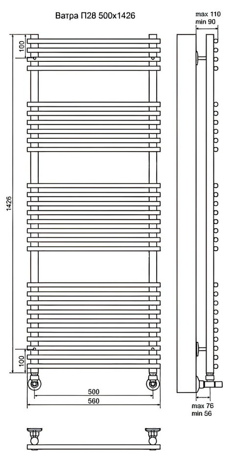 Полотенцесушитель водяной Terminus Ватра П28 500x1426, ширина 56 см, высота 142.6 см, хром