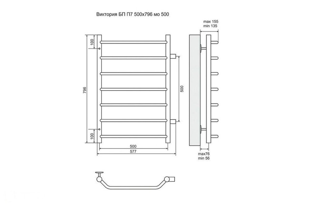 Полотенцесушитель водяной Terminus Виктория П7 500x796-500, ширина 57.7 см, высота 79.6 см, боковое подключение 50 см, хром