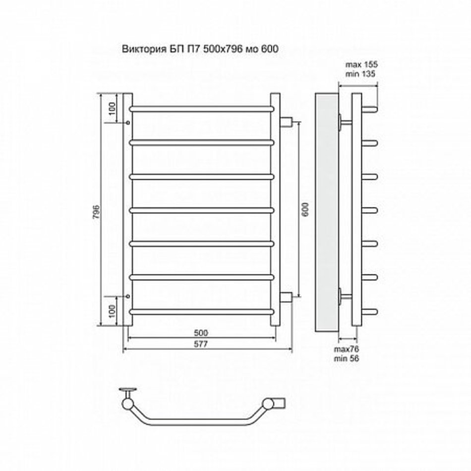 Полотенцесушитель водяной Terminus Виктория П7 500x796-600, ширина 57.7 м, высота 79.6 см, боковое подключение 60 см, хром