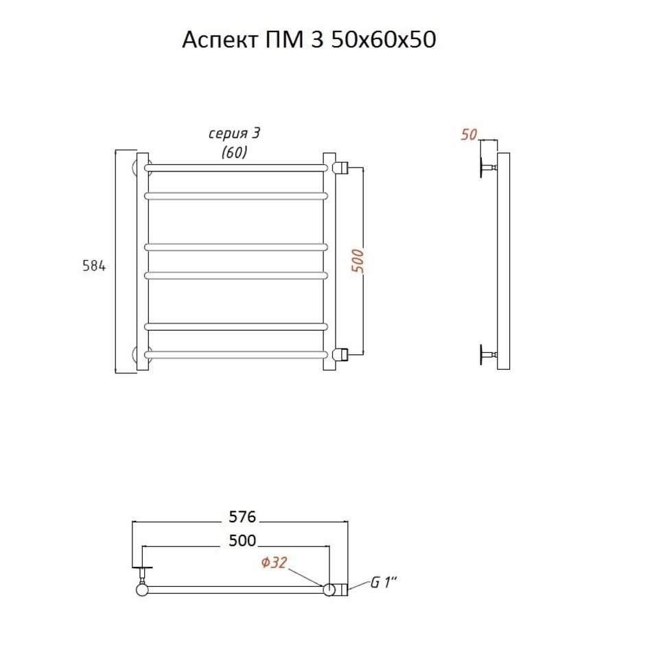 Полотенцесушитель водяной Тругор Аспект ПМ 3 50 х 60 x 50 (ЛЦ6), ширина 57.6 см, высота 58.4 см, хром