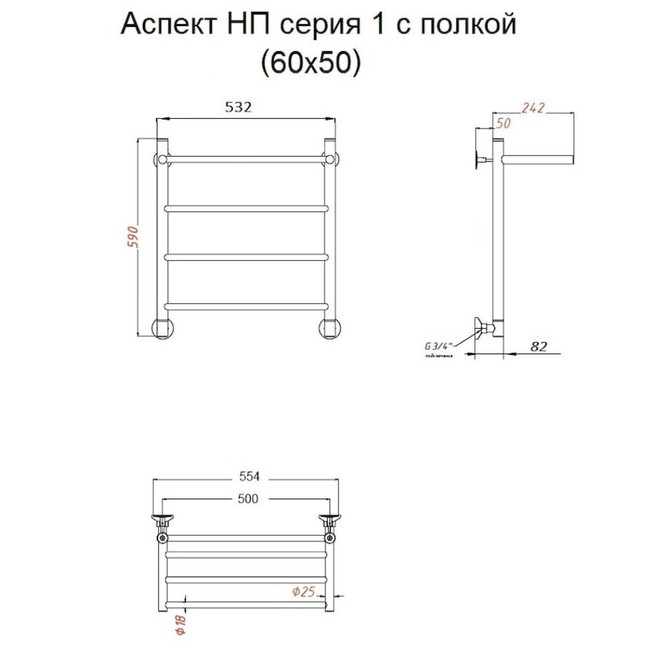 Полотенцесушитель водяной Тругор Аспект серия 1, Аспект1/нп6050П, ширина 55 см, высота 60 см, подключение нижнее, с полкой, хром