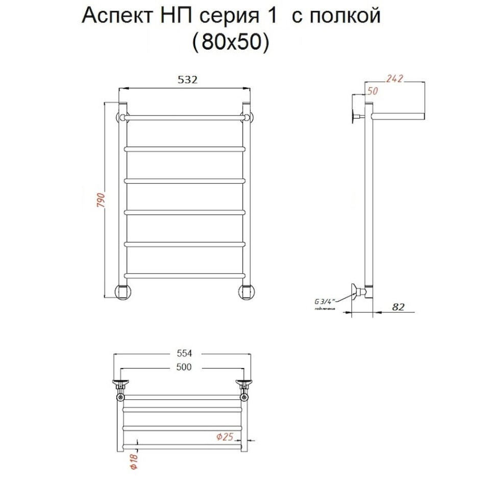 Полотенцесушитель водяной Тругор Аспект серия 1, Аспект1/нп8050П, ширина 50 см, высота 80 см, подключение нижнее, с полкой, хром