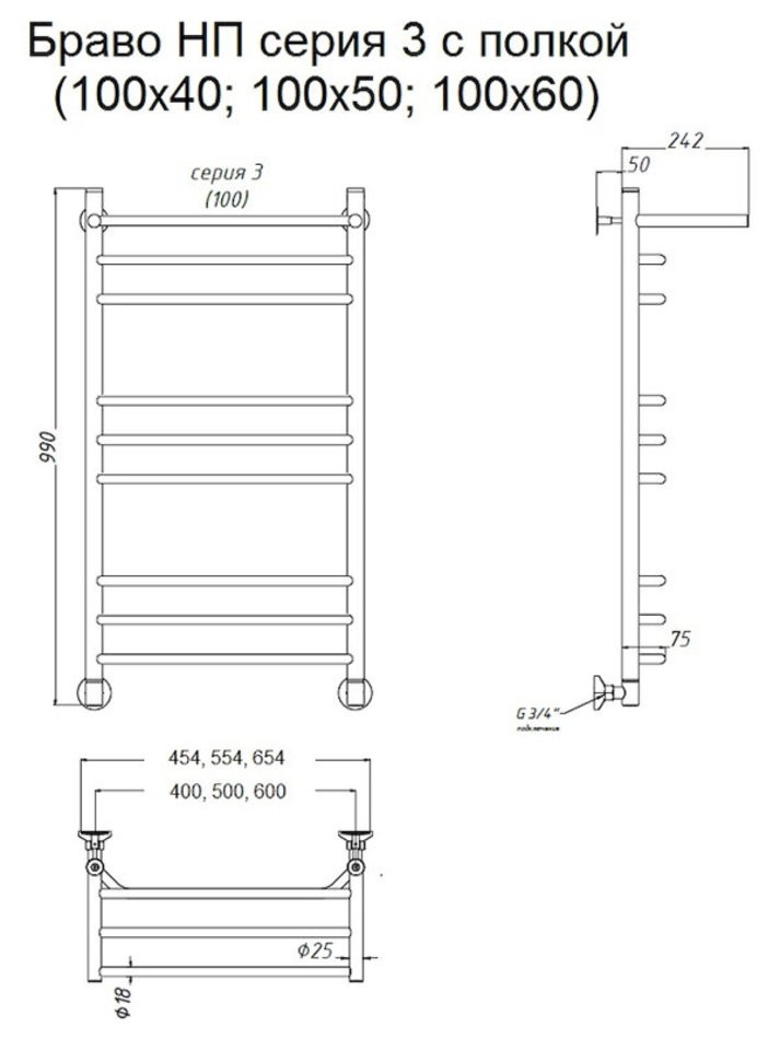 Полотенцесушитель водяной Тругор Браво НП 3 П 100 х 50 (ЛЦ4), ширина 55.4 см, высота 100.6 см, хром