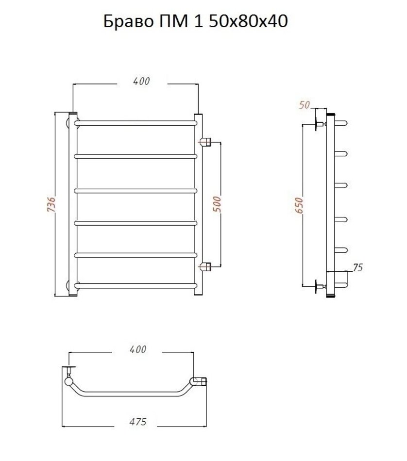 Полотенцесушитель водяной Тругор Браво ПМ 1 50 х 80 x 40 (ЛЦ4), ширина 47.5 см, высота 73.6 см, хром