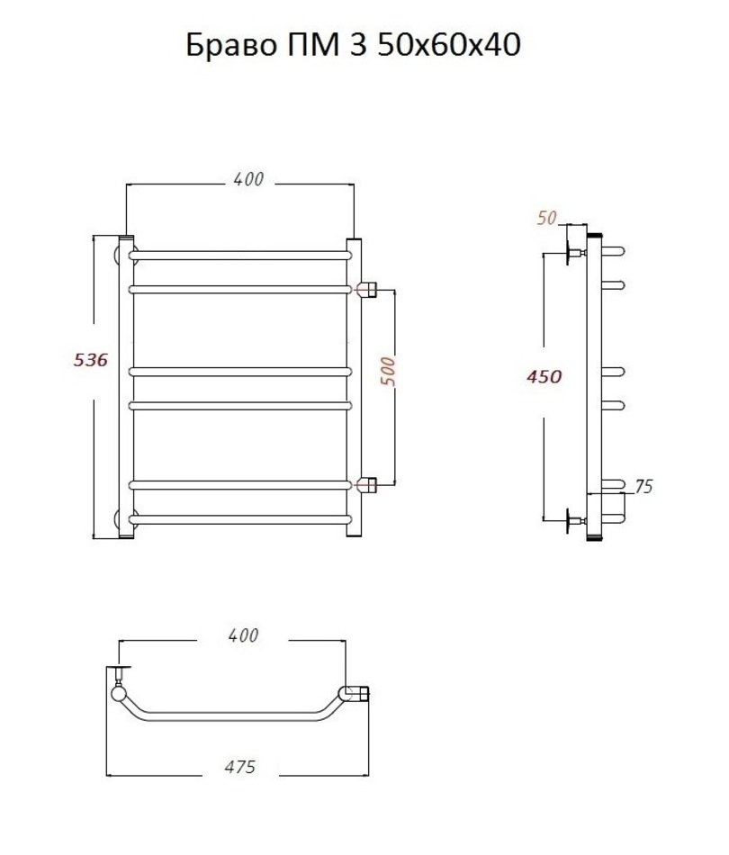 Полотенцесушитель водяной Тругор Браво ПМ 3 50 х 60 x 40 (ЛЦ4), ширина 47.5 см, высота 53.6 см, хром