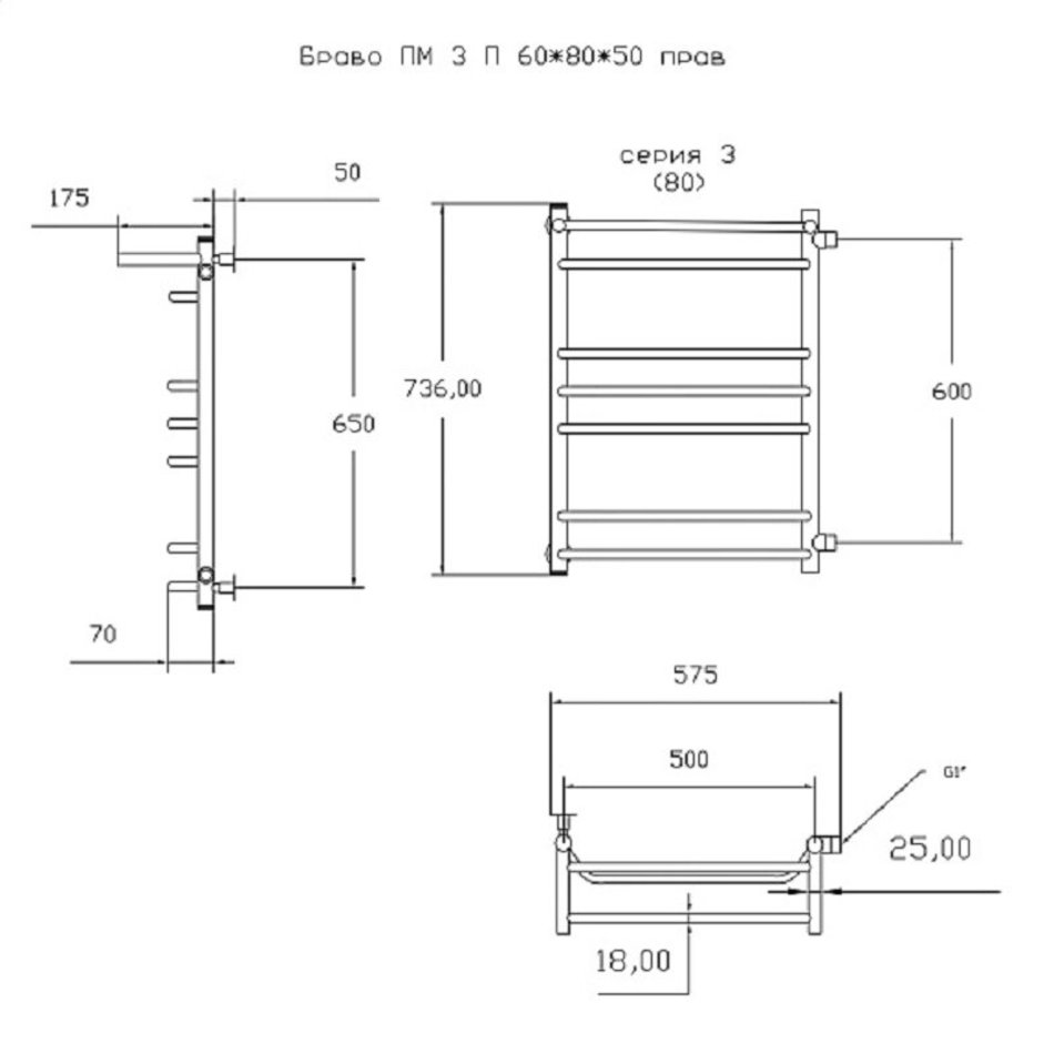 Полотенцесушитель водяной Тругор Браво ПМ 3 П 60.80.50 (ЛЦ4) прав, ширина 50 см, высота 80 см, Браво3/ПМ608050Пправ, боковое подключение 60 см, цвет хром