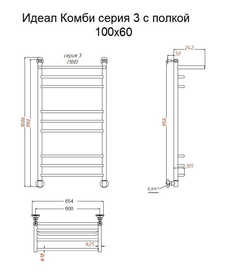Полотенцесушитель водяной Тругор Идеал комби НП 3 П 100 x 60 (ЛЦ17), ширина 65.4 см, высота 100.6 см, хром