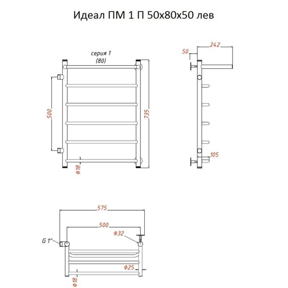 Полотенцесушитель водяной Тругор Идеал ПМ серия 1 П, Идеал1/ПМ508050Плев, ширина 50 см, высота 80 см, подключение боковое левое 50 см, с полкой, хром