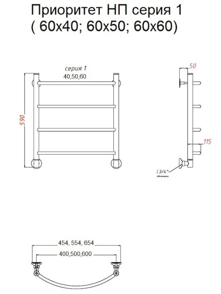 Полотенцесушитель водяной Тругор Приоритет НП 1 60 x 50 (ЛЦ2), ширина 55.4 см, высота 60.6 см, хром
