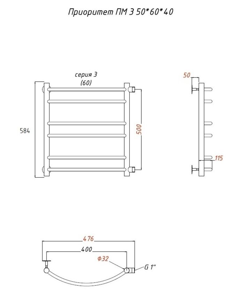 Полотенцесушитель водяной Тругор Приоритет ПМ 3 50 х 60 x 40 (ЛЦ4), ширина 47.6 см, высота 58.4 см, хром