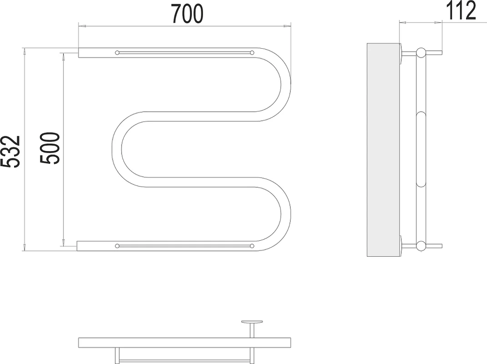Полотенцесушитель водяной Terminus М-образный 4620768880353, ширина 70 см, высота 53 см, боковое подключение 50 см, 1 дюйм, с полкой, цвет нержавеющая сталь