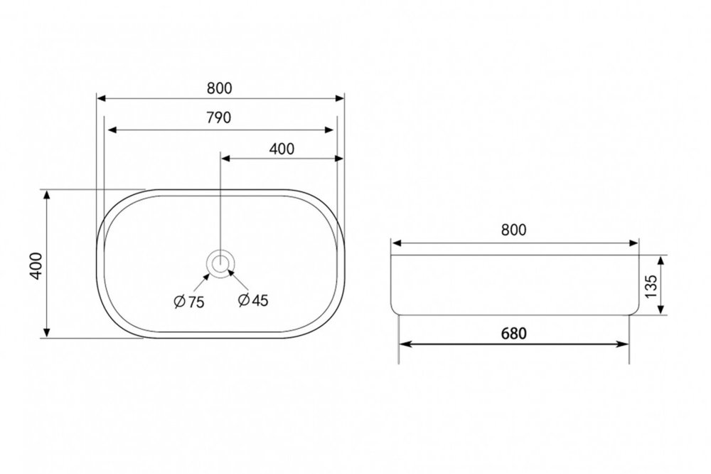 - Без отверстия перелива.