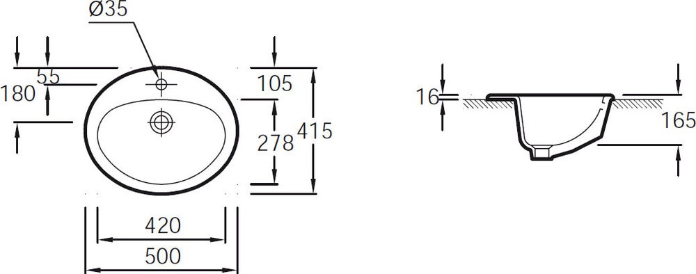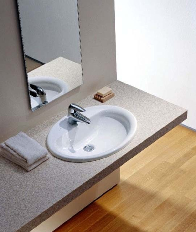 Раковина Ovale E1358 встраивается сверху, установка на столешницу, керамика. Приятная округлая форма. Накладная круглая раковина подойдет любителям завершенных форм, будет удобна при компактном размещении сантехники, одно отверстие для смесителя, два – размечено.