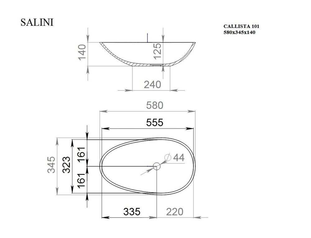 Раковина накладная Salini Paola, 58 x 34,5 х 14 см, из материала Sapirit, глянцевая белая, 1101101G