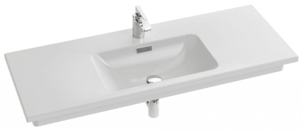 Изящная подвесная раковина-столешница с гладкой нижней поверхностью (для установки на мебель), размером 120х46 см с одним отверстием для смесителя.К заказу вместе с мебелью EB2020, EB2041 или EB2071, EB2091 (4 ручки на выбор). Широкие полочки, большая и глубокая раковина с мягкими краями без острых углов для легкой очистки. Гладкая нижняя поверхность.