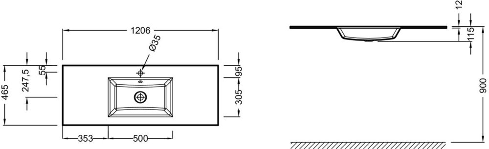 Изящная раковина-столешница с гладкой нижней поверхностью (для установки на мебель), размером 120х46 см с одним отверстием для смесителя.