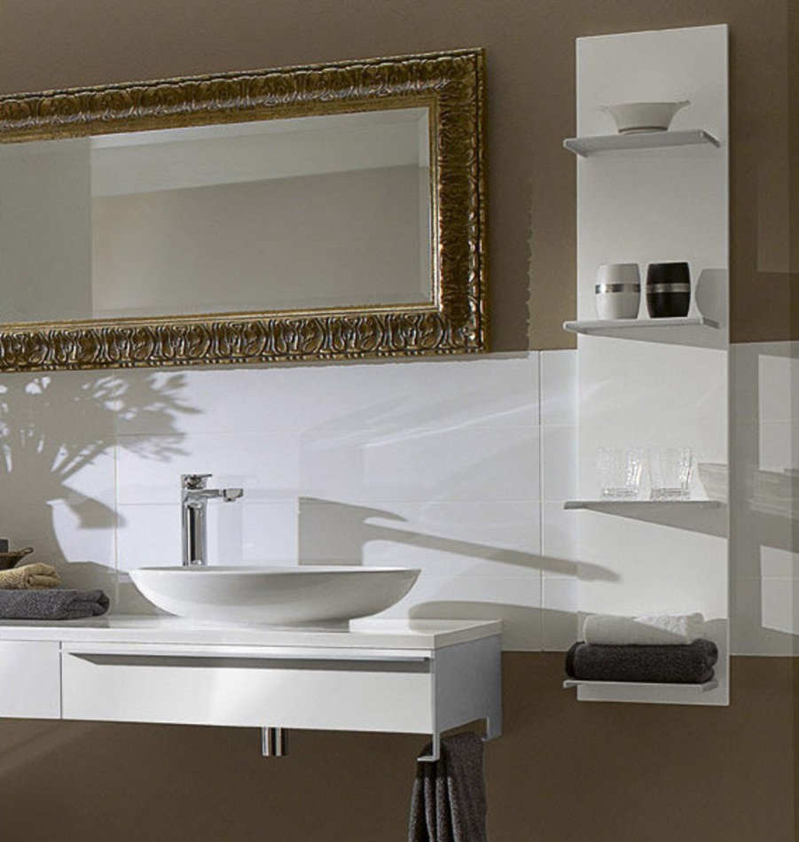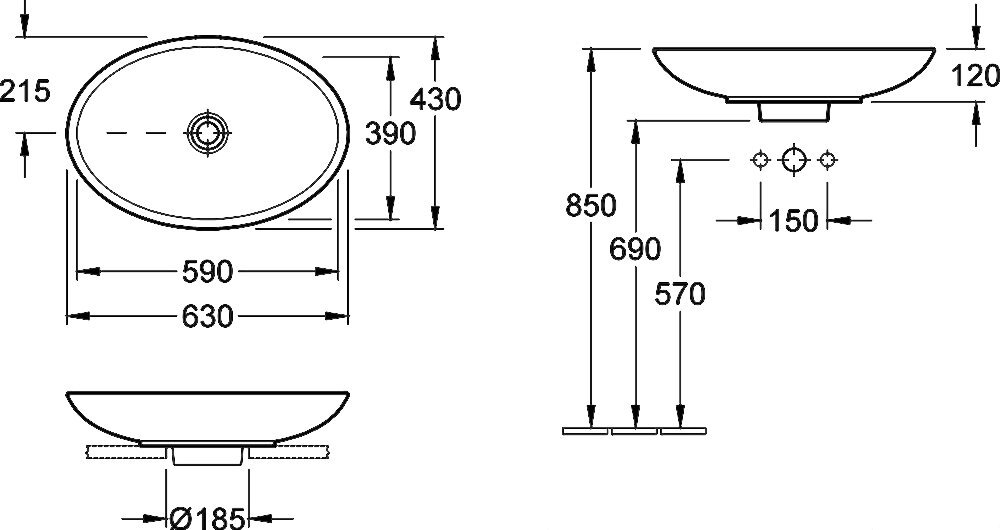 Белая овальная раковина, монтируемая к столешнице без отверстий под смеситель.