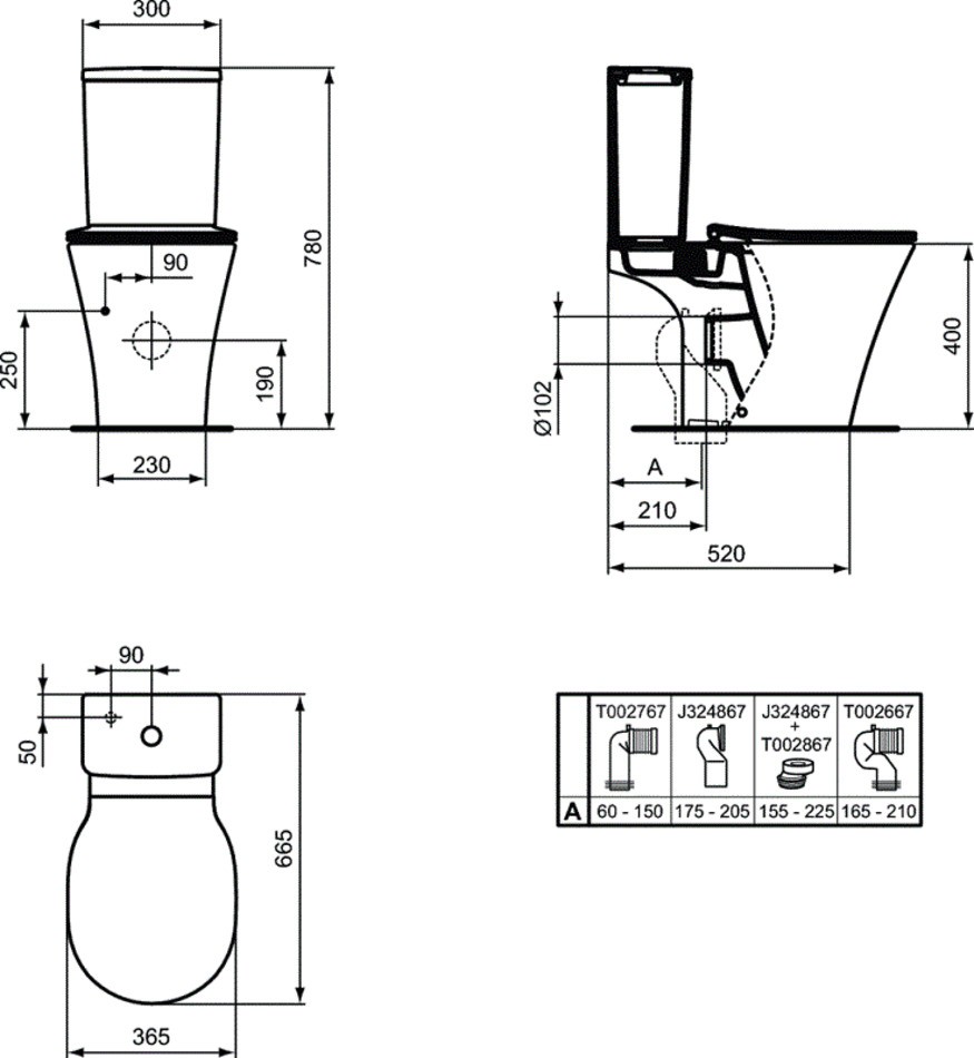 - горизонтальный выпуск (может дополняться пластиковыми выпускными патрубками на 90˚);