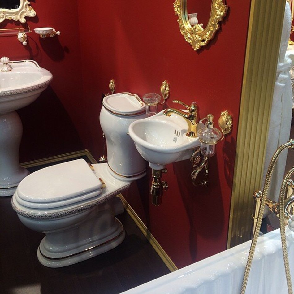 - Унитаз моноблок, выпуск в стену/пол, декор: золото/хром/бронза