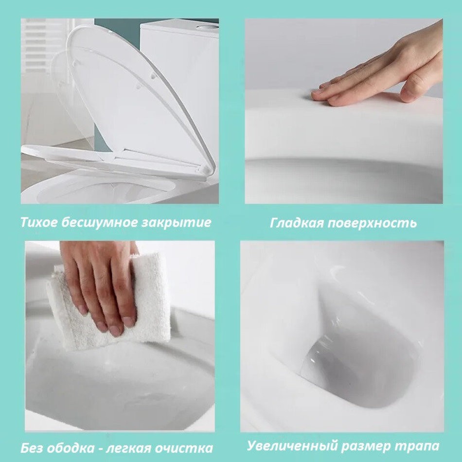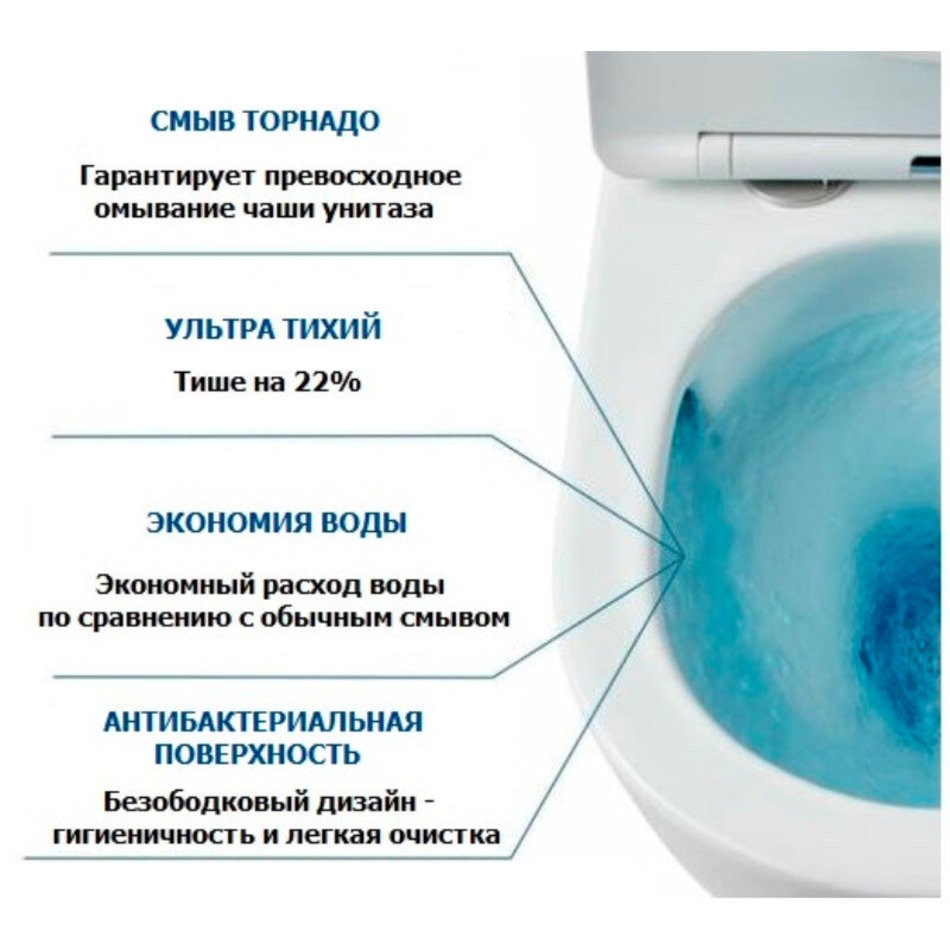 Стильный безободковый унитаз с мощным смывом - торнадо. Тонкое сиденье с плавным опусканием из дюропласта.