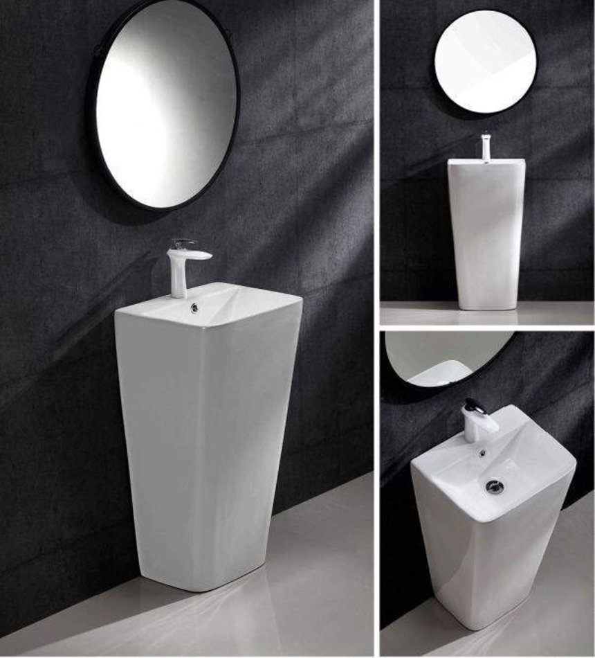 - Пластичность материала позволяет изготавливать сантехнику разнообразных форм, поэтому напольные раковины представлены в разных дизайнерских решениях.
